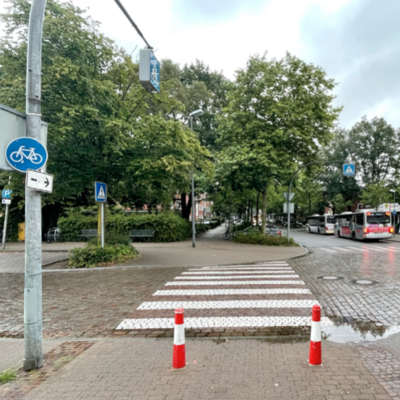 Vor dem Bahnhof führt die Veloroute 4 vorbei, auch die könnte man sinnvoller gestalten. Die aktuelle Wegeführung bis zum Sportplatz zwingt Radfahrende, auf einer Strecke von weniger als 400 Metern entlang der Stormarnstraße nicht nur ganz normal dreimal eine Straße zu überqueren, sondern zusätzlich viermal die Straßenseite zu wechseln. Ich sehe mich als Radfahrer also in der Bredouille, entweder Zickzack zu fahren oder ordnungswidrig zu handeln. Schaut mal hier, wie das für einen Radfahrer aussieht!