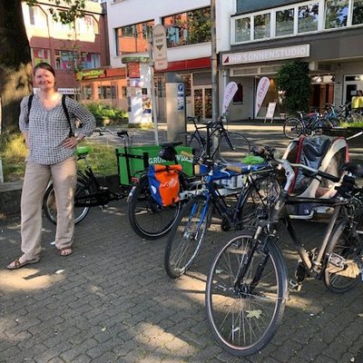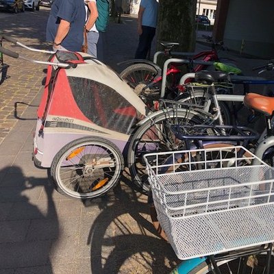 Auf Initiative der Grünen fand letztens eine Ortsbegehung mit der Verwaltung sowie einigen Interessierten vom adfc statt, bei dem die Nutzbarkeit möglicher Flächen rund um den Markt mit Lastenrädern und Anhänger-Gespannen praktisch erprobt wurde. Dabei zeigte sich: Es kommt nicht nur auf den Abstellort, sondern auch auf dessen Erreichbarkeit an. Ein möglicher Standort am Tiefgaragenzugang beispielsweise ist an Markttagen schwer erreichbar. Auf der gegenüberliegenden Seite läuft der Rathausplatz in mehreren "Buchten" zwischen den Bäumen aus. Hier stehen zwar häufig Autos, es sind aber keine offiziellen Autoparkplätze ausgewiesen. In eine solche Bucht würden - das haben wir auch ausprobiert! - 4 Lastenräder nebeneinander passen. Mit einer frisch erneuerten Rampe vom Bordstein herunter wären diese Plätze auch an Markttagen gut erreichbar. Dies schien der Gruppe die beste Lösung zu sein. Wenn der Platz gut angenommen wird, könnte auch eine der Nachbarbuchten für Lastenräder genutzt werden.