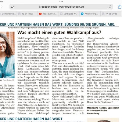 Nun ist sie vorbei, die intensive Zeit des Wahlkampfes. Vorbei sind die monatelangen Vorbereitungen, interne Wahlen zu Besetzung von Wahlkreisen und Kandidierenden-Liste sowie unzählige Gedanken dazu, wie wir grüne Ideen in Ahrensburg platzieren wollen.