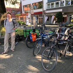 Auf Initiative der Grünen fand letztens eine Ortsbegehung mit der Verwaltung sowie einigen Interessierten vom adfc statt, bei dem die Nutzbarkeit möglicher Flächen rund um den Markt mit Lastenrädern und Anhänger-Gespannen praktisch erprobt wurde. Dabei zeigte sich: Es kommt nicht nur auf den Abstellort, sondern auch auf dessen Erreichbarkeit an. Ein möglicher Standort am Tiefgaragenzugang beispielsweise ist an Markttagen schwer erreichbar. Auf der gegenüberliegenden Seite läuft der Rathausplatz in mehreren "Buchten" zwischen den Bäumen aus. Hier stehen zwar häufig Autos, es sind aber keine offiziellen Autoparkplätze ausgewiesen. In eine solche Bucht würden - das haben wir auch ausprobiert! - 4 Lastenräder nebeneinander passen. Mit einer frisch erneuerten Rampe vom Bordstein herunter wären diese Plätze auch an Markttagen gut erreichbar. Dies schien der Gruppe die beste Lösung zu sein. Wenn der Platz gut angenommen wird, könnte auch eine der Nachbarbuchten für Lastenräder genutzt werden.