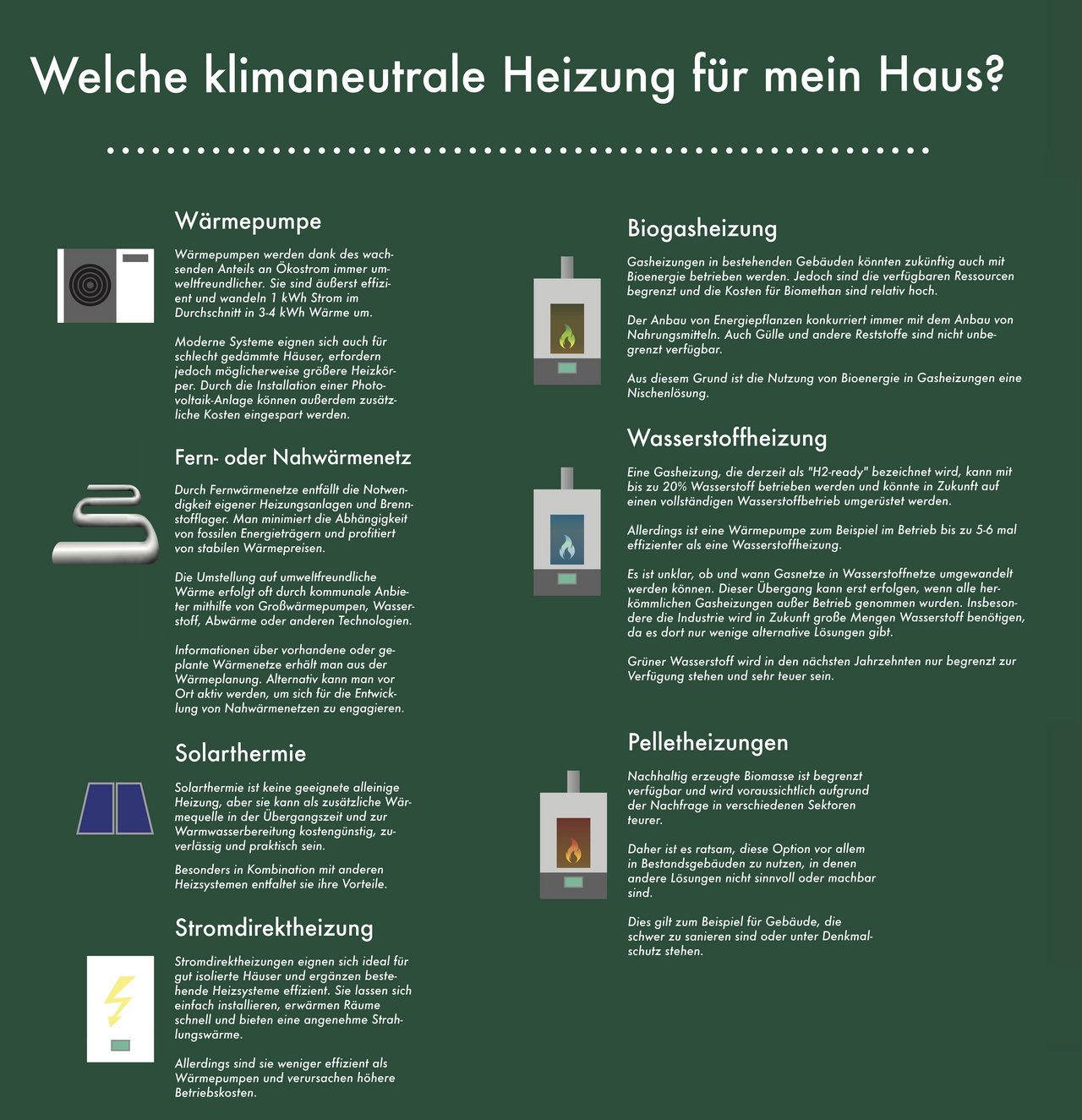 Hier finden Sie eine Übersicht über ökologisch mehr oder minder empfehlenswerte Heizmethoden mit ihren Vor- und Nachteilen.