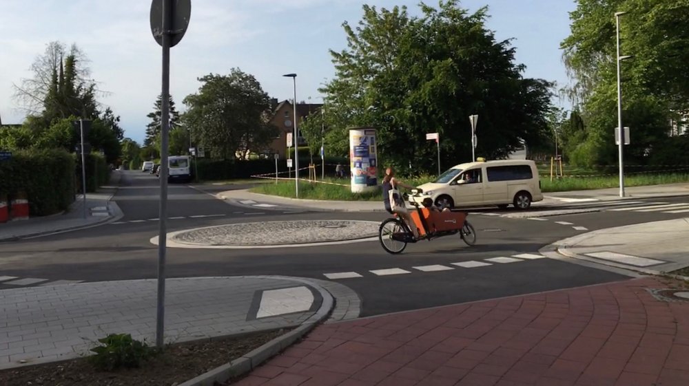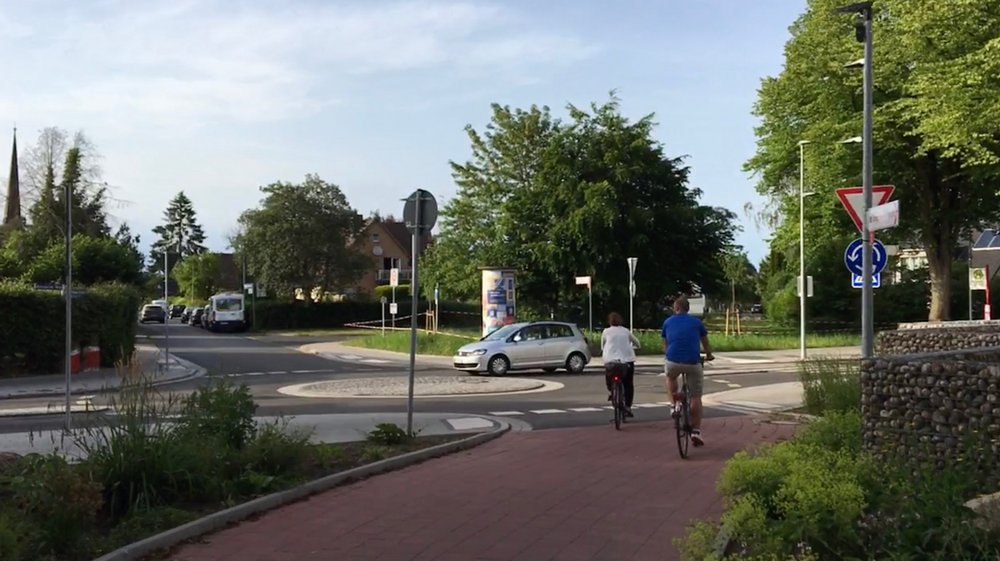 Die Grünen treten ein für ein gleichberechtigtes Miteinander im Straßenverkehr. Darum freuen wir uns, dass der Minikreisel an der Kreuzung Wulfsdorfer Weg / Rudolf-Kinau-Straße / Katzenbuckel errichtet wurde. Nunmehr sind Radfahrende gleichberechtigt mit dem Autoverkehr auf der Fahrbahn unterwegs. Wer im Kreisel fährt, hat Vorfahrt - egal ob Rad oder Auto. Da ein Kreisverkehr zu einer Reduzierung der Geschwindigkeit von PKW führt, steigt für alle Beteiligten die Sicherheit im Straßenverkehr. Dank zweier "Zebrastreifen" ist der Wulfsdorfer Weg nun auch zu Fuß leichter zu überqueren.