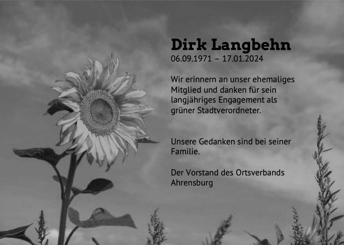 So sei denn in aller Stille gesagt: BÜNDNIS90/ DIE GRÜNEN Ahrensburg haben im März 2022 solch ein langjähriges Mitglied verloren. Wir danken von Herzen für ihre treue Unterstützung über mehr als zwei Jahrzehnte hinweg und möchten auch an dieser Stelle ihren Angehörigen unser herzliches Beileid ausdrücken.